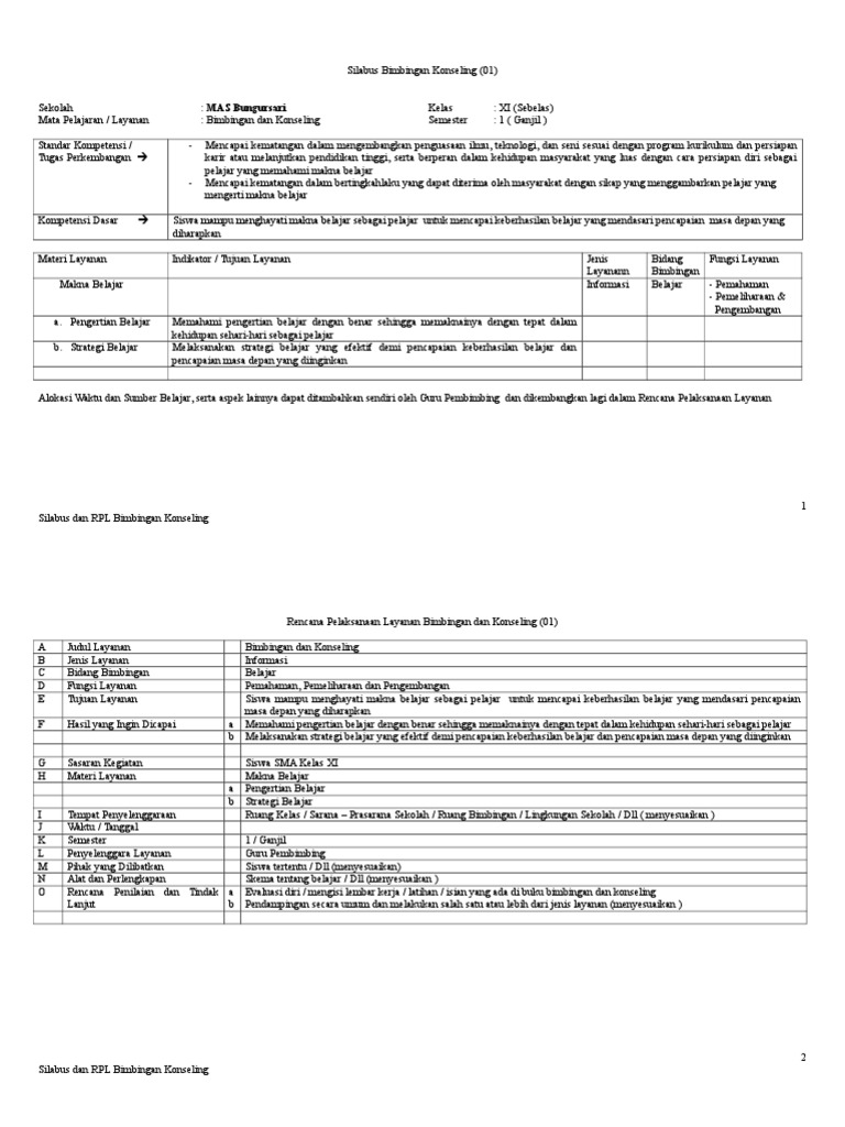 Doc Silabus Pelayanan Bimbingan Dan Konseling Berbasis Komptensi Herni Cimbol Academia Edu from 0.academia-photos.com Yukakaki lihat profil lengkapku menu halaman statis. File silabus kurikulum 2013 bk kelas 10 sma yang akan saya berikan ini merupakan file silabus versi terbaru yang di dalamnya telah di lengkapi materi mulai dari semester 1 hingga materi semester 2. Jika pada kurikulum tingkat satuan pendidikan (ktsp), satuan pendidikan dan guru diberikan kewenangan menyusun silabus maka pada kurikulum 2013 beban tersebut ditanggung oleh pemerintah. Jika dtelaah secara seksama dalam pasal 4 ayat (4) dituliskan bahwa pembimbingan paling sedikit 5 (lima) rombongan belajar ( rombel) per tahun, berarti bisa dijabarkan sebagai berikut: Jika saat ini sedang membutuhkan kerangka silabus bimbingan konseling k13 tingkat smp kelas 7 semester 1 dan semester 2, bisa langsung download di artikel ini bagian bawah. Adalah untuk mengetahui strategi guru bk dalam membina sikap konformitas siswa di sman 1 teunom. Contoh silabus bimbingan konseling (bk) sma/ma/smk kelas 10 semester 1 dan 2 kurikulum 2013 revisi tahun 2020. Rppguru.com adalah blog yang berbagi informasi 28+ kunci jawaban matematika kelas 5 kurikulum 2013 revisi 2017 images, kunci jawaban, aplikasi dan administrasi guru yang mana file berikut ini adalah kumpulan dari berbagi sumber tentang perangkat pembelajaran bk kurikulum 2013 sma yang bisa bapak/ibu gunakan dan diunduh secara gratis dengan.
